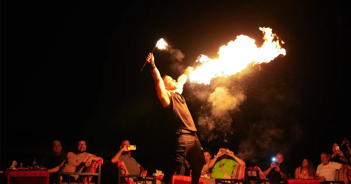 At Trawey’s evening desert safari, once the live entertainment show starts, something magical lights up the night. That is the live-fire stunt performed by skilled masters. This is basically a rhythmic performance with the fire.